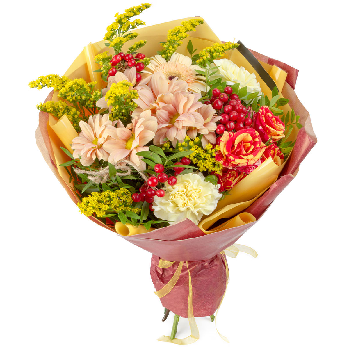 Хризантема кустовая, гербера, гвоздика пионовидная, роза кустовая двухцветная, статица желтая, гиперикум. Упаковка (лента, пленка, крафт, сетка, пленка матовая)
