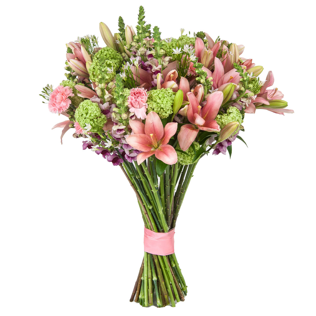 Лилия розовая, гвоздика розовая, львиный зев сиреневый, гортензия зеленая. Упаковка (лента, пленка, крафт, сетка, пленка матовая)