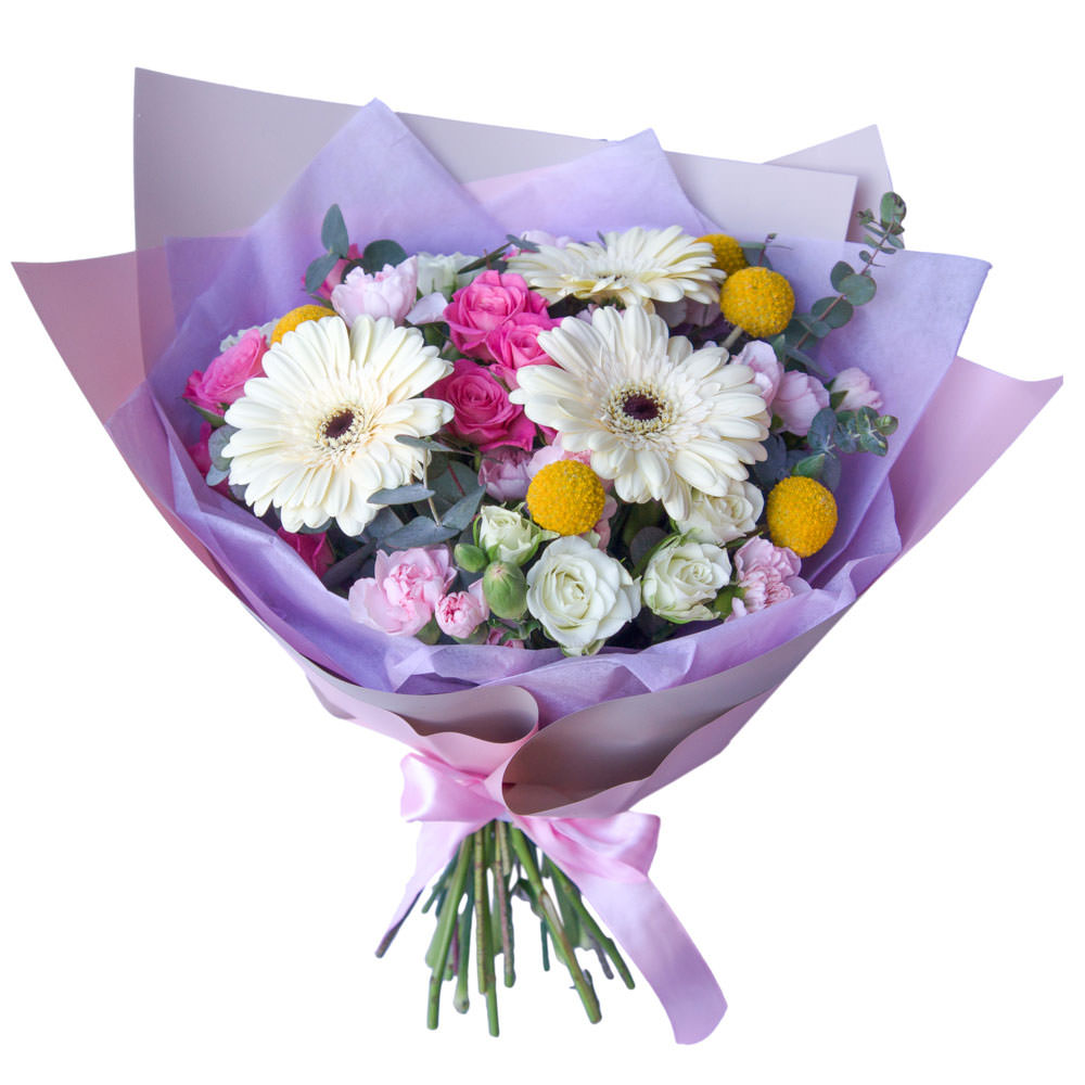 Гербера белая, роза кустовая микс (белая, розовая), эвкалипт, хризантема кустовая. Упаковка (лента, пленка, крафт, сетка, пленка матовая)