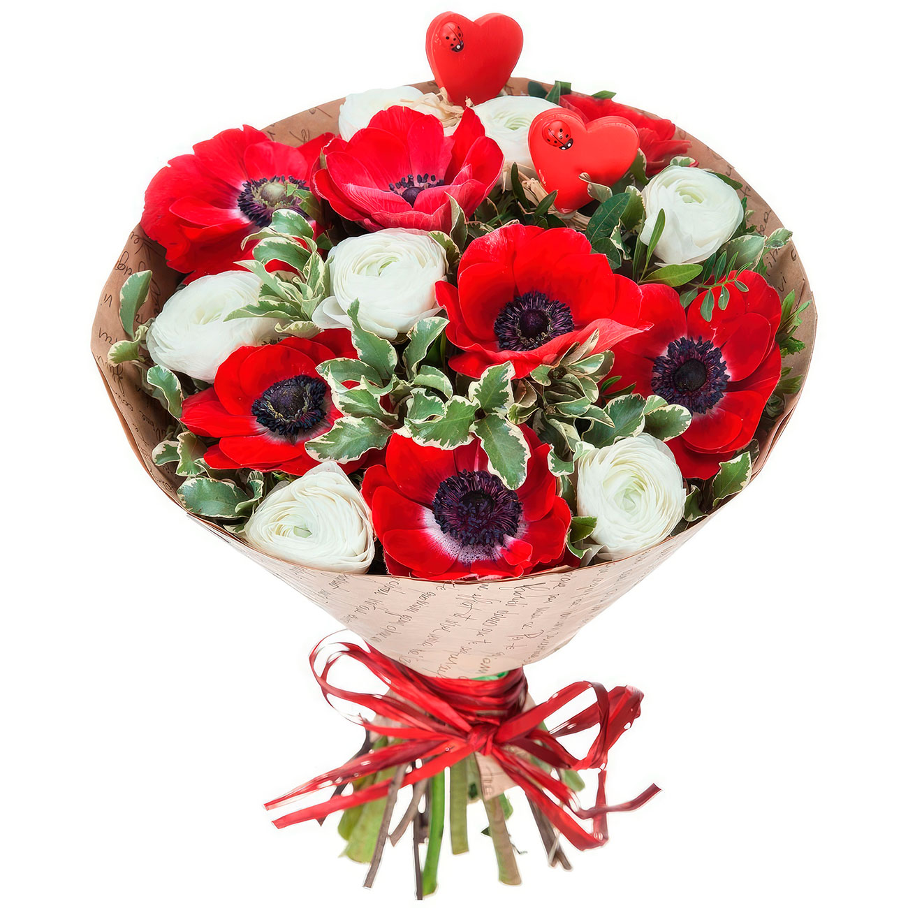Мак, ранункулюс мини белый, зелень. Упаковка (лента, пленка, крафт, сетка, пленка матовая)