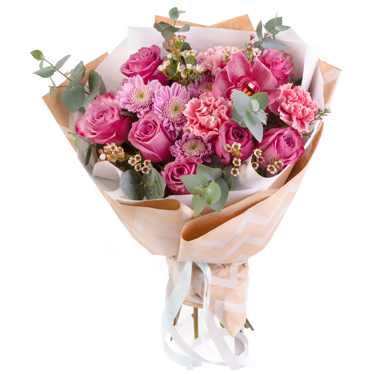 Роза одноголовая розовая, орхидея розовая, хризантема кустовая сиреневая, ваксфлауэр, эвкалипт. Упаковка (лента, пленка, крафт, сетка, пленка матовая)