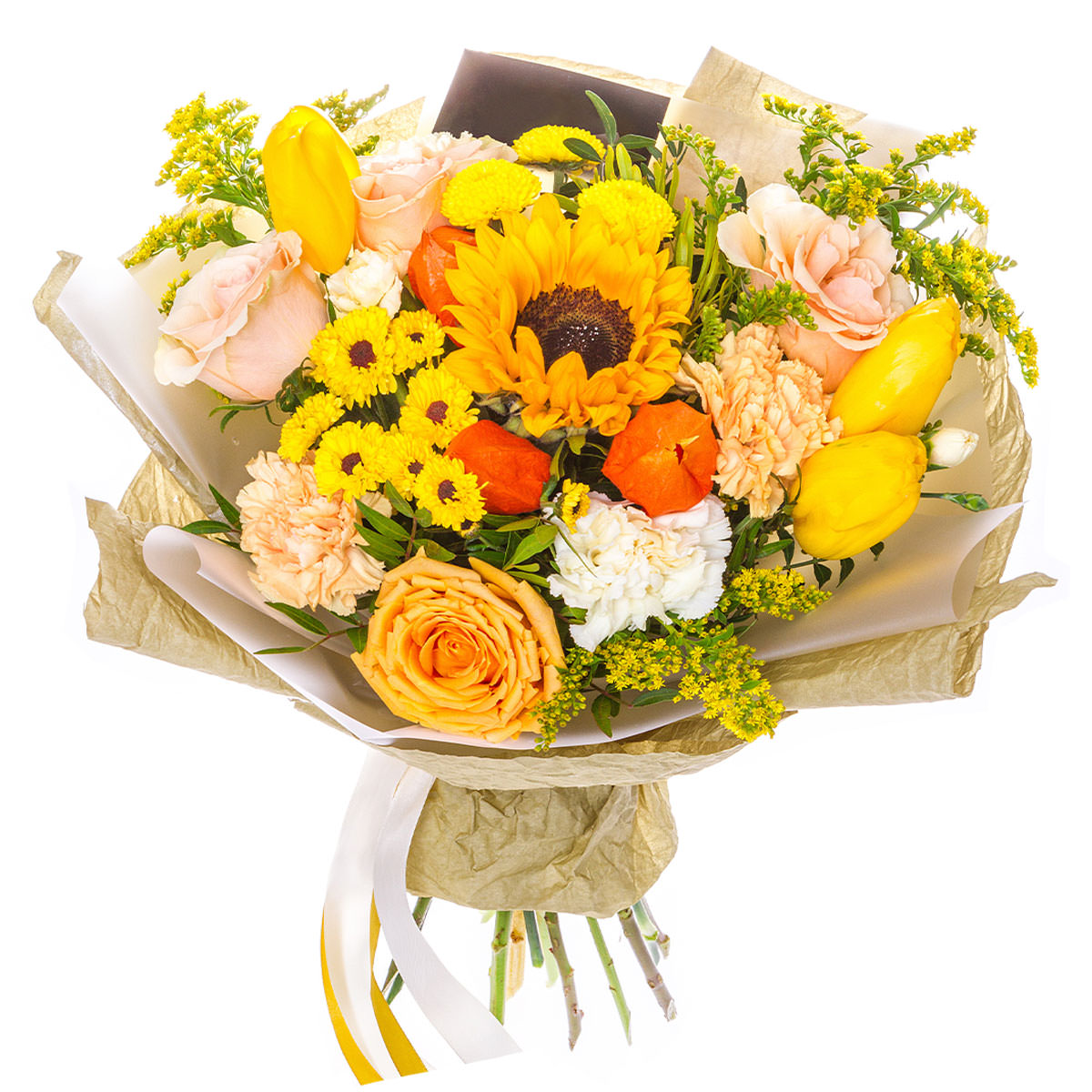 Подсолнух, хризантема кустовая желтая, тюльпан желтый, роза одноголовая оранжевая и розовая, хризантема белая и персиковая, физалис, солидаго. Упаковка (лента, пленка, крафт, сетка, пленка матовая)