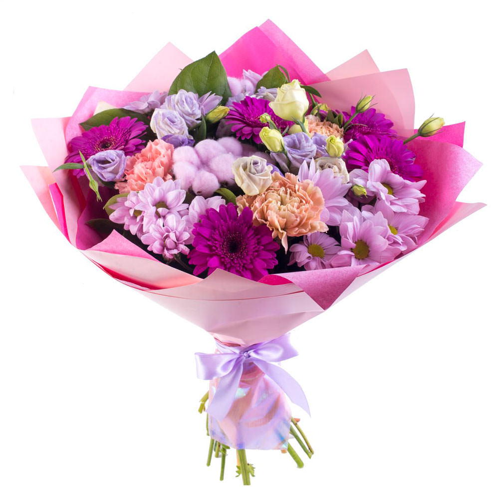 Гербера сиреневая, хризантема кустовая сиреневая, эустома светло-фиолетовая и белая, гвоздика кремовая, хлопок. Упаковка (лента, пленка, крафт, сетка, пленка матовая)