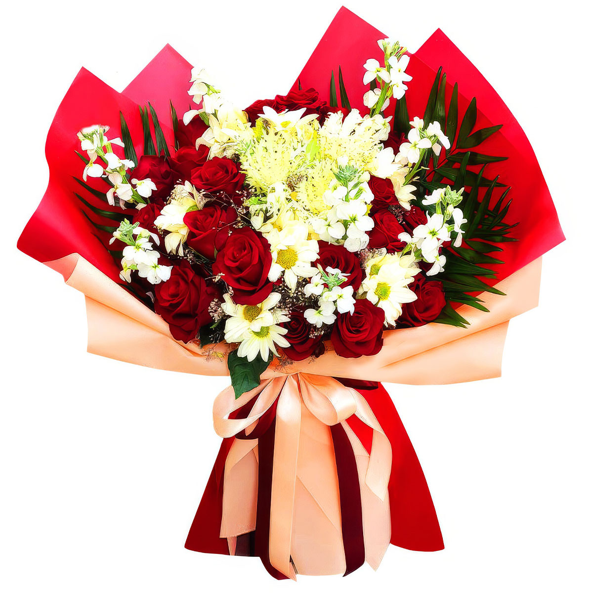 Роза одноголовая красная, хризантема кустовая белая, маттиола белая, листья пальмы. Упаковка (лента, пленка, крафт, сетка, пленка матовая)