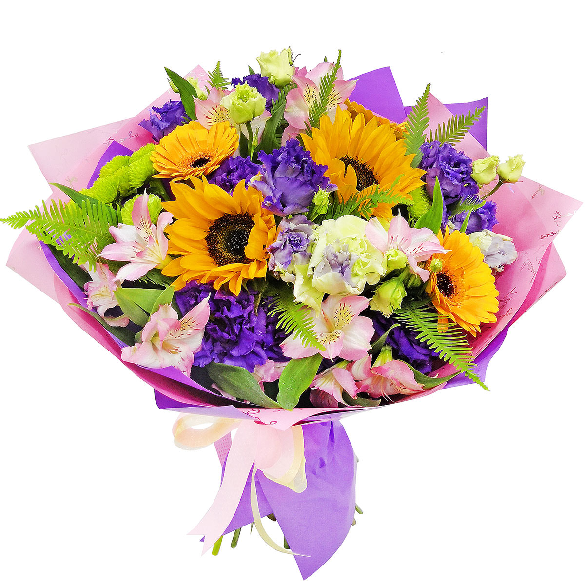 Подсолнух, эустома фиолетовая, альстромерия розовая, хризантема кустовая зеленая, аспарагус. Упаковка (лента, пленка, крафт, сетка, пленка матовая)