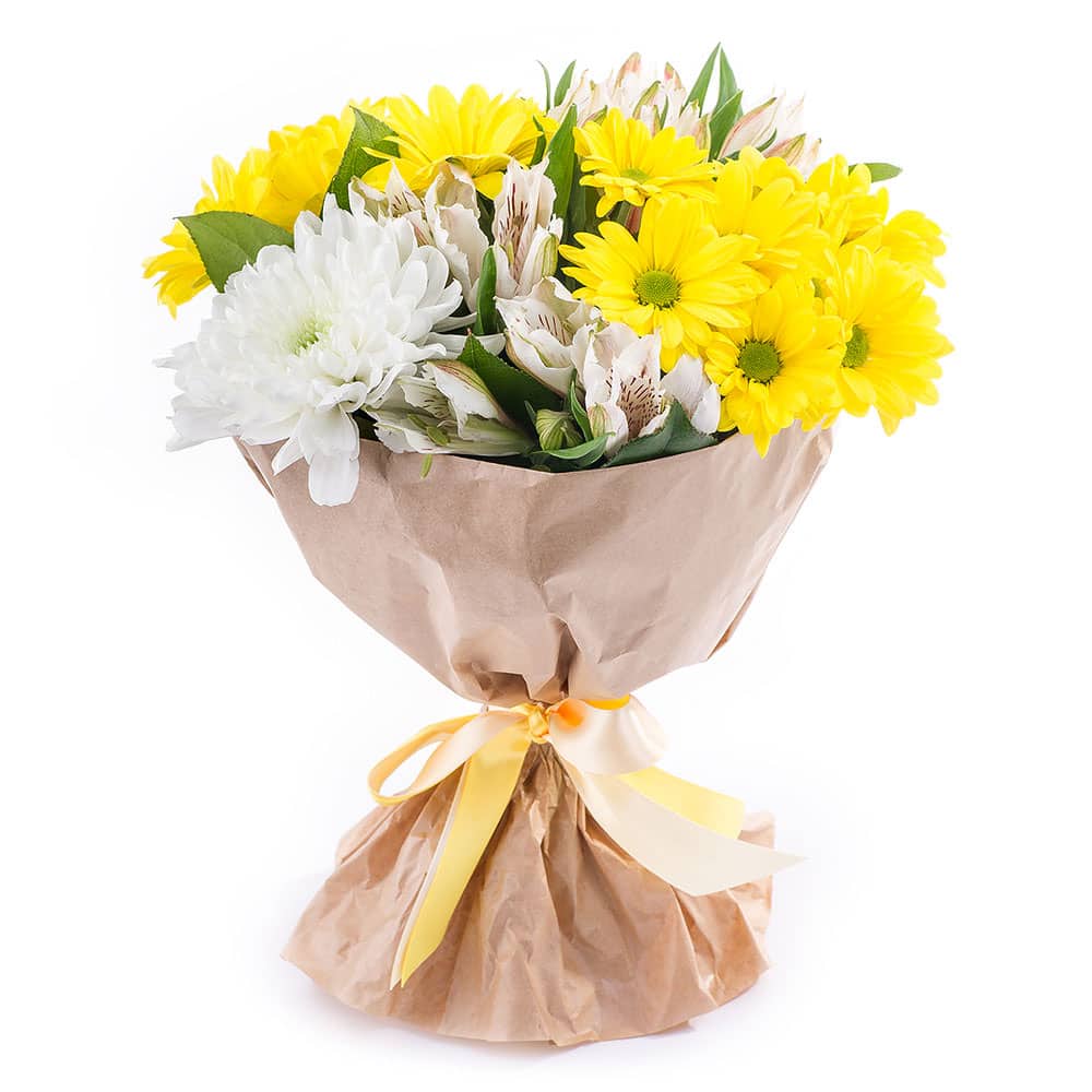 Хризантема одноголовая белая, хризантема кустовая желтая, альстромерия белая. Упаковка (лента, пленка, крафт, сетка, пленка матовая)