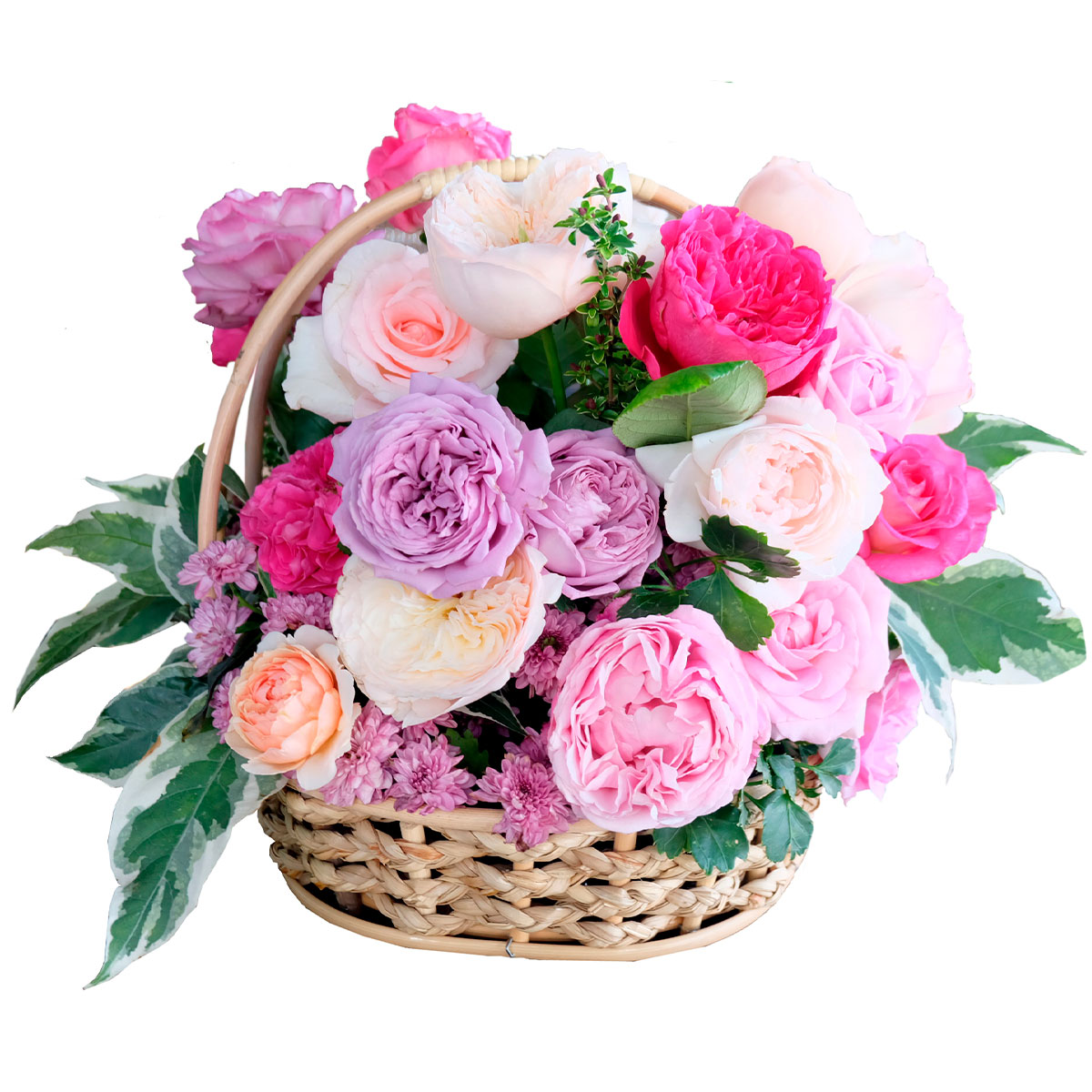 Роза одноголовая пионовидная розовая, роза кустовая розовая, хризантема кустовая розовая мини. Упаковка (Корзина, оазис, ящик).