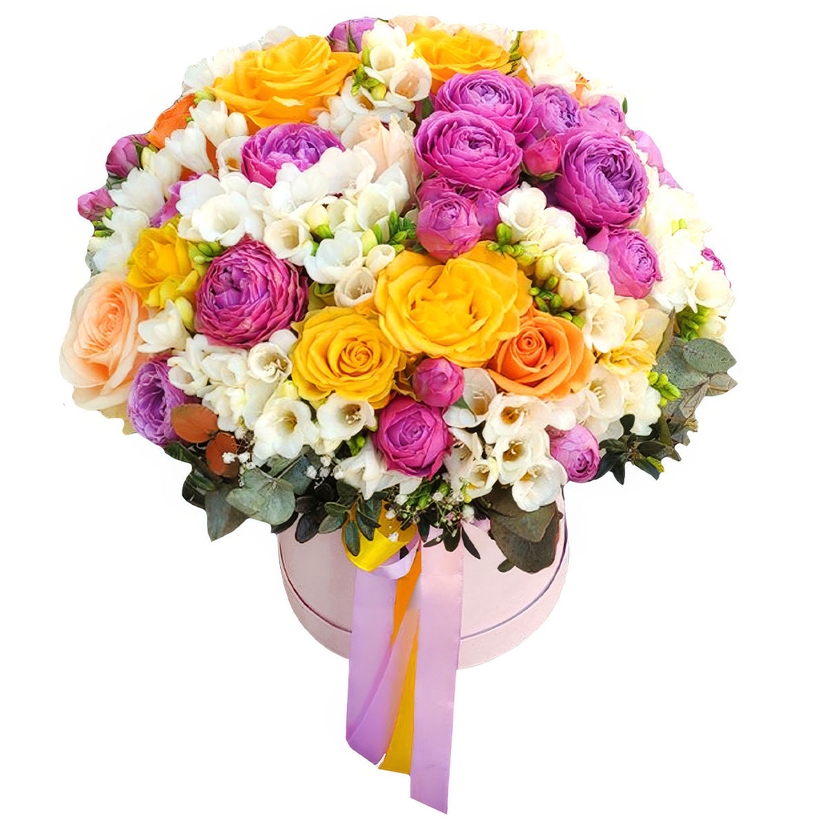 Роза пионовидная сиреневая, роза одноголовая персиковая, роза кустовая желтая, фрезия белая, гипсофила, эвкалипт. Упаковка (шляпная коробка, квадратный бокс, коробка сердце, оазис)