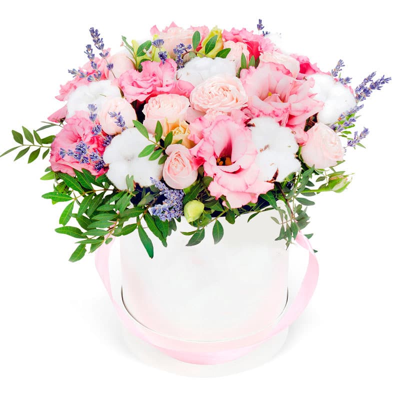 Эустома розовая, роза кустовая нежно-розовая, хлопок, сухоцветы, фисташка, оазис. Упаковка (шляпная коробка)