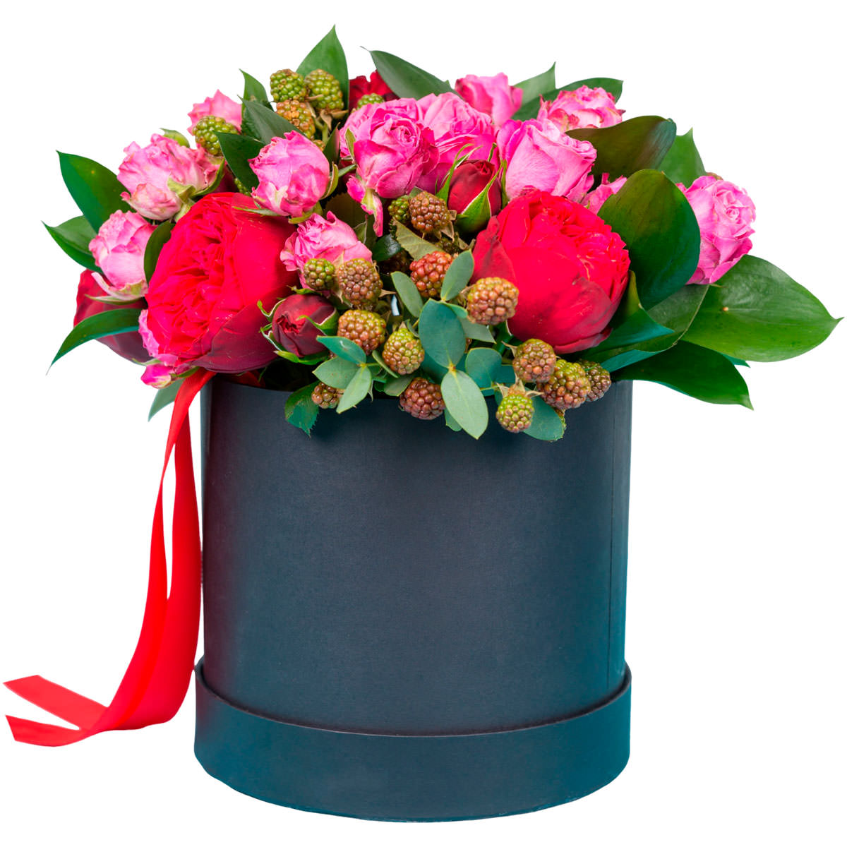 Роза пионовидная красная, роза кустовая розовая, аспидистра, куст ежевики. Упаковка (шляпная коробка, квадратный бокс, коробка сердце, оазис)