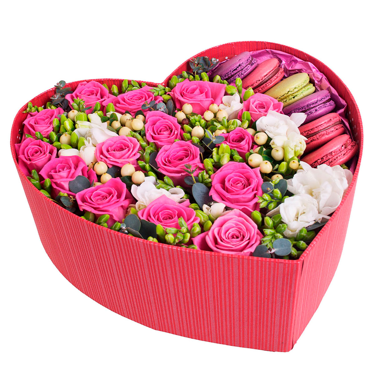 Роза одноголовая розовая, фрезия белая, гиперикум, макарон. Упаковка (шляпная коробка, квадратный бокс, коробка сердце, оазис)