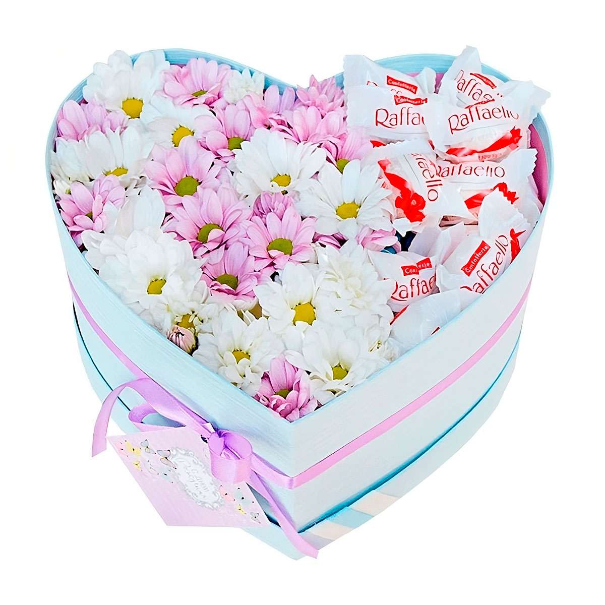 Хризантемы кустовые микс (белая, сиреневая), конфеты, оазис. Упаковка (шляпная коробка, квадратный бокс, коробка сердце, оазис)