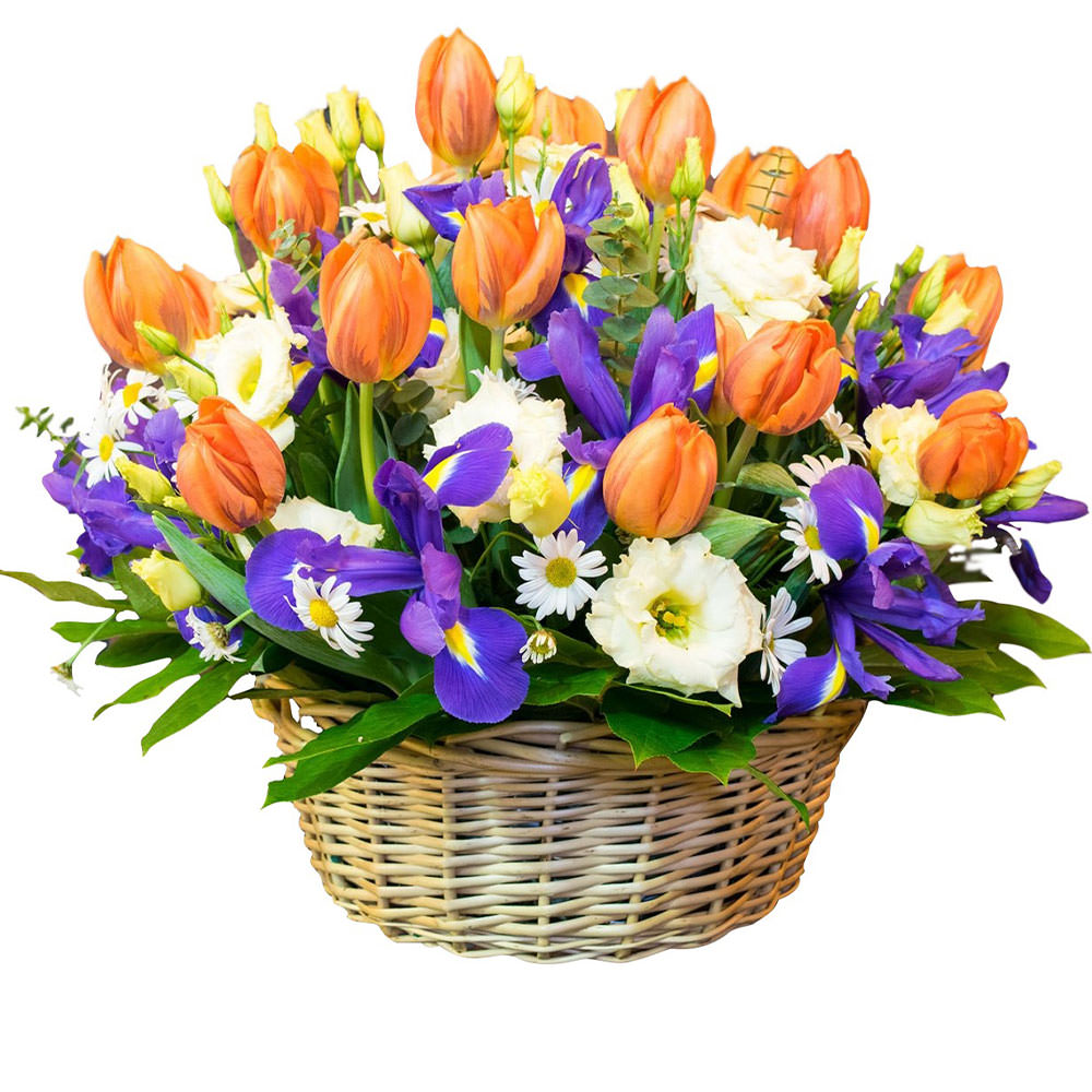 Тюльпан оранжевый, ирис, ромашка кустовая, эустома белая, зелень. Упаковка (Корзина, оазис).